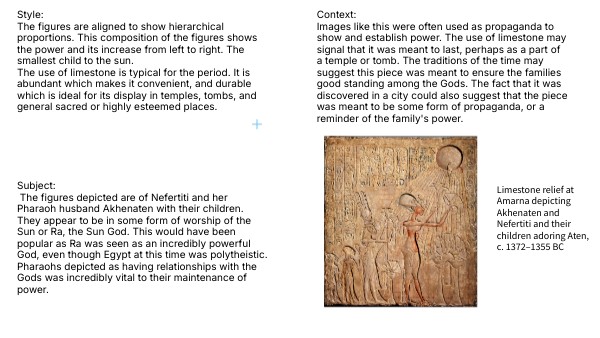 Subject: The figures depicted are of Nefertiti and her Pharaoh husband Akhenaten with their children. They appear to be in some form of worship of the Sun or Ra, the Sun God. This would have been popular as Ra was seen as an incredibly powerful God, even though Egypt at this time was polytheistic. Pharaohs depicted as having relationships with the Gods was incredibly vital to their maintenance of power.