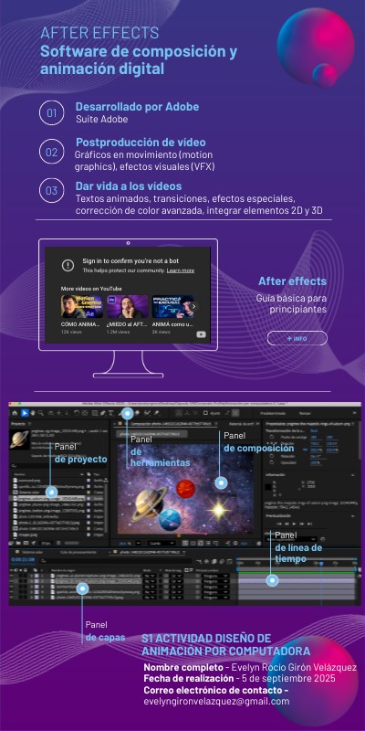 Animación de capas: puedes mover, escalar, rotar y transformar cualquier elemento usando keyframes. Efectos visuales (VFX): incluye una gran librería de efectos como desenfoques, partículas, corrección de color, distorsiones, transiciones, entre otros. Composición avanzada: permite combinar videos, imágenes y gráficos en un mismo espacio de trabajo. Compatibilidad con otros programas de Adobe: se integra muy bien con Premiere Pro, Photoshop e Illustrator. Soporte 2D y 3D: aunque es más usado en 2D, también maneja cámaras, luces y capas 3D para simular profundidad. Expresiones y scripts: con un poco de código puedes automatizar animaciones complejas.