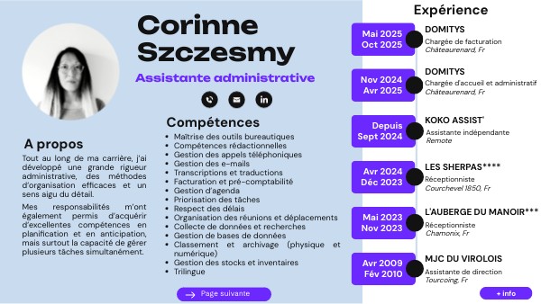 Tout au long de ma carrière, j’ai développé une grande rigueur administrative, des méthodes d’organisation efficaces et un sens aigu du détail. Mes responsabilités m’ont également permis d’acquérir d’excellentes compétences en planification et en anticipation, mais surtout la capacité de gérer plusieurs tâches simultanément.