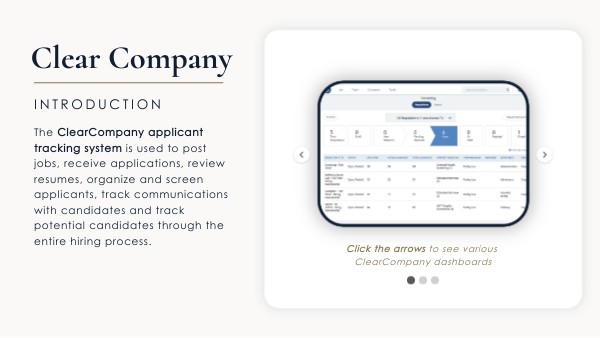 The ClearCompany applicant tracking system is used to post jobs, receive applications, review resumes, organize and screen applicants, track communications with candidates and track potential candidates through the entire hiring process.