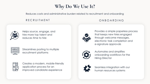 Provides a simple paperless process that keeps new hires engaged through welcome messages, electronic task completion and e-signature approvals