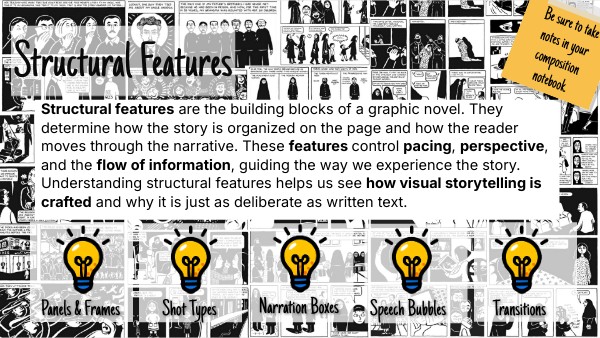 Structural features are the building blocks of a graphic novel. They determine how the story is organized on the page and how the reader moves through the narrative. These features control pacing, perspective, and the flow of information, guiding the way we experience the story. Understanding structural features helps us see how visual storytelling is crafted and why it is just as deliberate as written text.