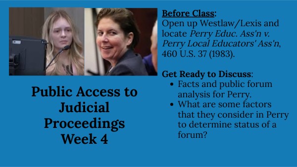 Viewpoint Discrimination: In Perry, the Court said restrictions based on status (not viewpoint) were permissible. What if we apply this logic to courtroom access? What if certain types of media (ex: advocacy journalists) are excluded?10:00