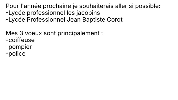 Pour l'année prochaine je souhaiterais aller si possible: -Lycée professionnel les jacobins -Lycée Professionnel Jean Baptiste Corot Mes 3 voeux sont principalement : -coiffeuse -pompier -police