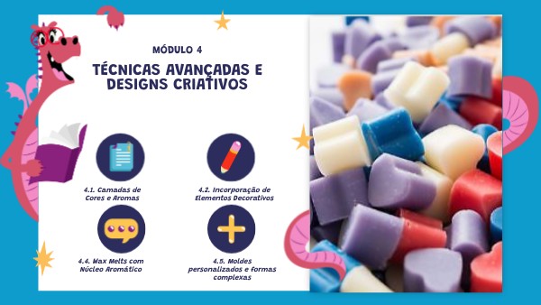 - Crie seus próprios moldes com silicone de grau alimentício (por exemplo, formatos de folhas, animais, logotipos). - Dica para detalhes finos: - Utilize cera com um pouco de estearina para maior rigidez. - Congele antes de desenformar.