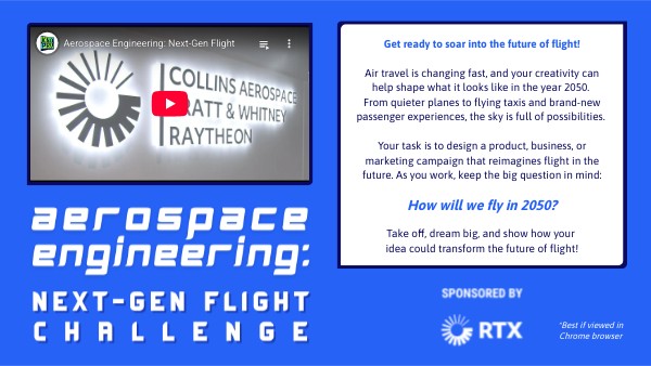 Get ready to soar into the future of flight! Air travel is changing fast, and your creativity can help shape what it looks like in the year 2050. From quieter planes to flying taxis and brand-new passenger experiences, the sky is full of possibilities. Your task is to design a product, business, or marketing campaign that reimagines flight in the future. As you work, keep the big question in mind: Take off, dream big, and show how your idea could transform the future of flight!