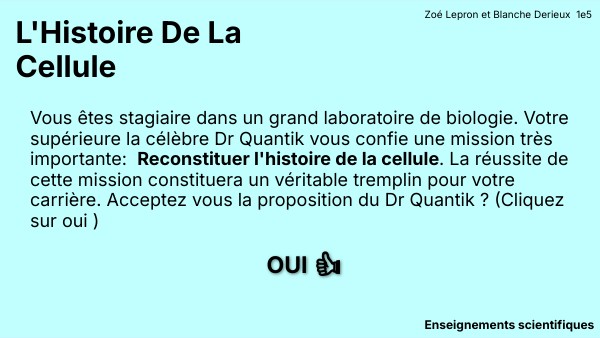 Vous êtes stagiaire dans un grand laboratoire de biologie. Votre supérieure la célèbre Dr Quantik vous confie une mission très importante: Reconstituer l'histoire de la cellule. La réussite de cette mission constituera un véritable tremplin pour votre carrière. Acceptez vous la proposition du Dr Quantik ? (Cliquez sur oui )