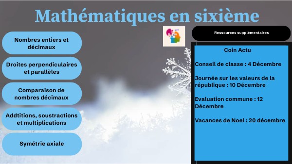 Coin Actu Conseil de classe : 4 Décembre Journée sur les valeurs de la république : 10 Décembre Evaluation commune : 12 Décembre Vacances de Noel : 20 décembre