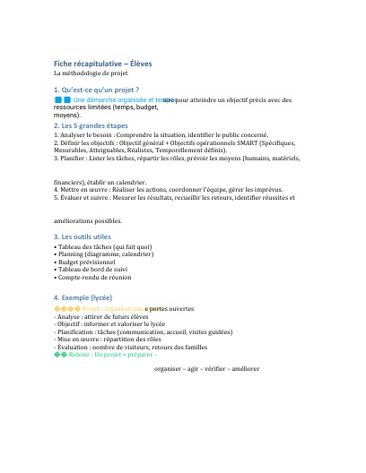 ���� Projet : organiser une journé- Analyse : attirer de futurs élèves - Objectif : informer et valoriser le lycée - Planification : tâches (communication, accueil, visites guidées) - Mise en œuvre : répartition des rôles - Évaluation : nombre de visiteurs, retours des familles �� Retenir : Un projet = préparer –