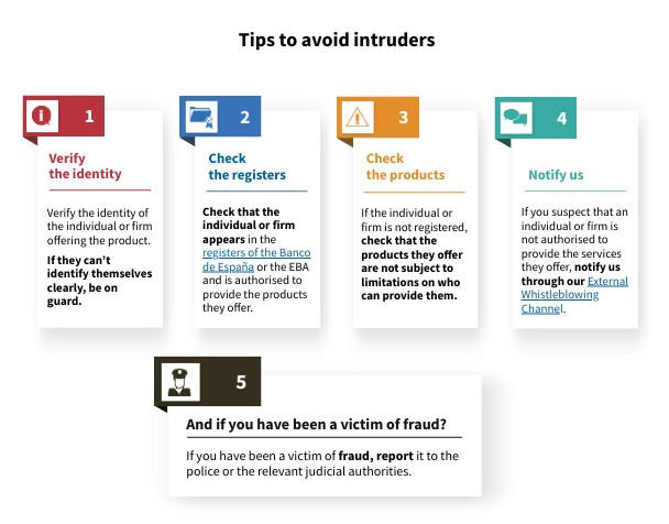 Check that the individual or firm appears in the registers of the Banco de España or the EBA and is authorised to provide the products they offer.
