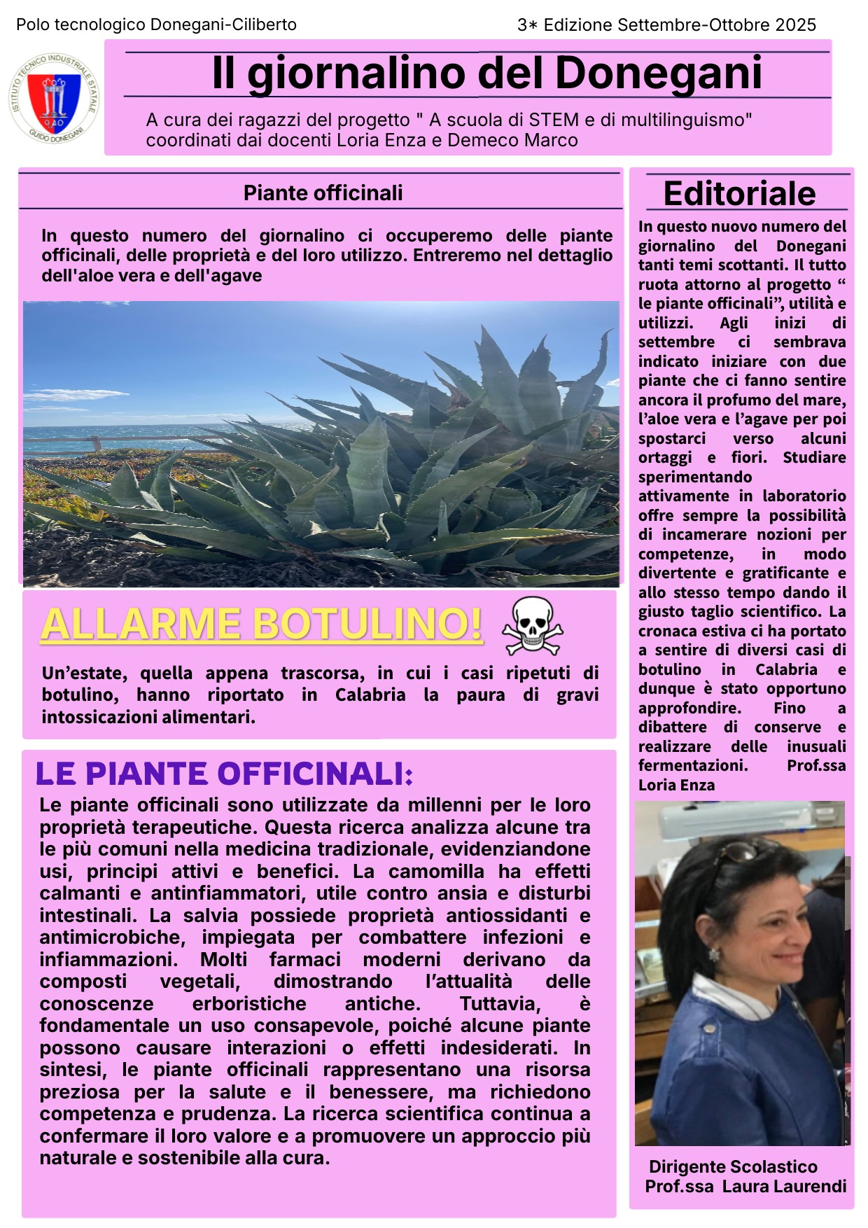 In questo nuovo numero del giornalino del Donegani tanti temi scottanti. Il tutto ruota attorno al progetto “ le piante officinali”, utilità e utilizzi. Agli inizi di settembre ci sembrava indicato iniziare con due piante che ci fanno sentire ancora il profumo del mare, l’aloe vera e l’agave per poi spostarci verso alcuni ortaggi e fiori. Studiare sperimentando attivamente in laboratorio offre sempre la possibilità di incamerare nozioni per competenze, in modo divertente e gratificante e allo stesso tempo dando il giusto taglio scientifico. La cronaca estiva ci ha portato a sentire di diversi casi di botulino in Calabria e dunque è stato opportuno approfondire. Fino a dibattere di conserve e realizzare delle inusuali fermentazioni. Prof.ssa Loria Enza