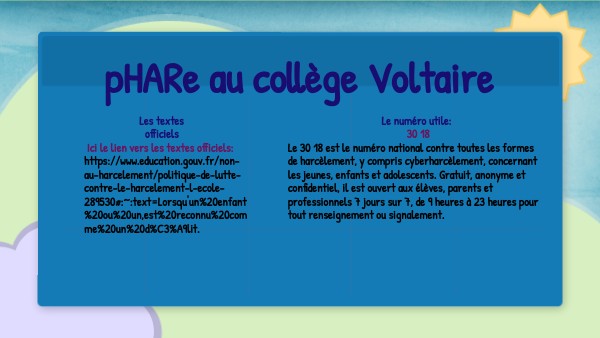 L'équipe ressources: Au collège Voltaire, une équipe ressource a été formée. Elle est composée de 8 adultes. Elle analyse les situations, elle communique avec les élèves et les familles, elle écoute les élèves, elle se réunit pour discuter et trouver des solutions.