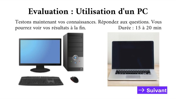 Testons maintenant vos connaissances. Répondez aux questions. Vous pourrez voir vos résultats à la fin. Durée : 15 à 20 min