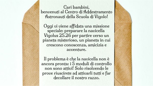 Cari bambini, benvenuti al Centro di Addestramento Astronauti della Scuola di Vigolo! Oggi vi viene affidata una missione speciale: preparare la navicella Vigolus 25.26 per partire verso un pianeta misterioso, un pianeta in cui crescono conoscenza, amicizia e avventure. Il problema è che la navicella non è ancora pronta: i 5 moduli di controllo non sono attivi! Solo risolvendo le prove riuscirete ad attivarli tutti e far decollare il nostro razzo.