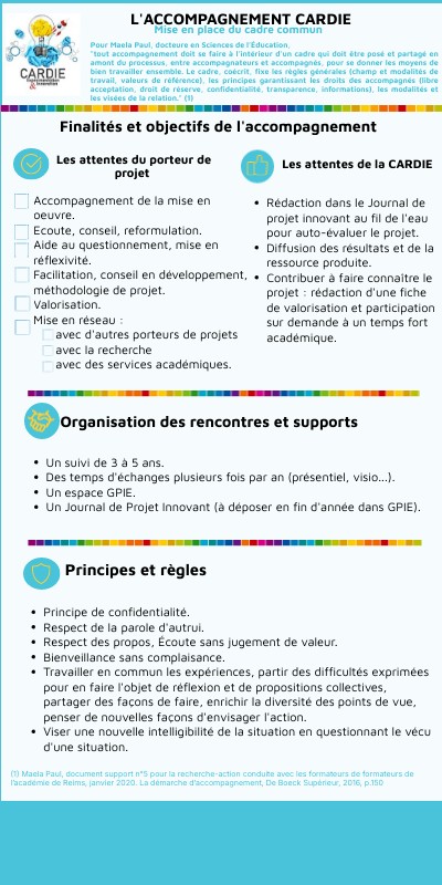 Pour Maela Paul, docteure en Sciences de l’Éducation, "tout accompagnement doit se faire à l’intérieur d’un cadre qui doit être posé et partagé en amont du processus, entre accompagnateurs et accompagnés, pour se donner les moyens de bien travailler ensemble. Le cadre, coécrit, fixe les règles générales (champ et modalités de travail, valeurs de référence), les principes garantissant les droits des accompagnés (libre acceptation, droit de réserve, confidentialité, transparence, informations), les modalités et les visées de la relation." (1)
