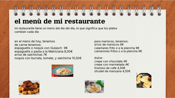 mi restaurante tiene un menù del dia del dia, lo que significa que los platos cambian cada dia