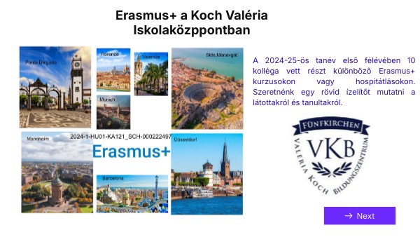 A 2024-25-ös tanév első félévében 10 kolléga vett részt különböző Erasmus+ kurzusokon vagy hospitátlásokon. Szeretnénk egy rövid ízelítőt mutatni a látottakról és tanultakról.