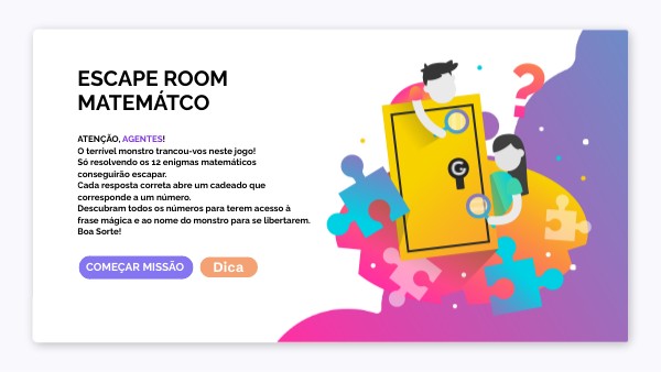ATENÇÃO, AGENTES!O terrível monstro trancou-vos neste jogo! Só resolvendo os 12 enigmas matemáticos conseguirão escapar. Cada resposta correta abre um cadeado que corresponde a um número. Descubram todos os números para terem acesso à frase mágica e ao nome do monstro para se libertarem. Boa Sorte!