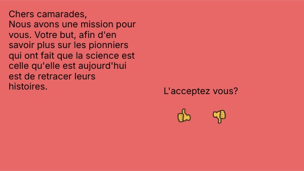Chers camarades, Nous avons une mission pour vous. Votre but, afin d'en savoir plus sur les pionniers qui ont fait que la science est celle qu'elle est aujourd'hui est de retracer leurs histoires.