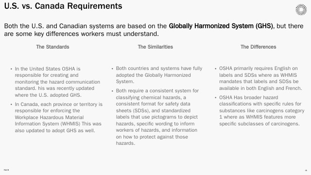 Both the U.S. and Canadian systems are based on the Globally Harmonized System (GHS), but there are some key differences workers must understand.