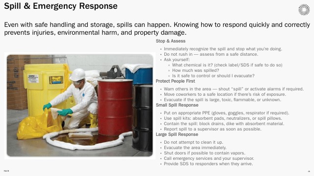 Even with safe handling and storage, spills can happen. Knowing how to respond quickly and correctly prevents injuries, environmental harm, and property damage.