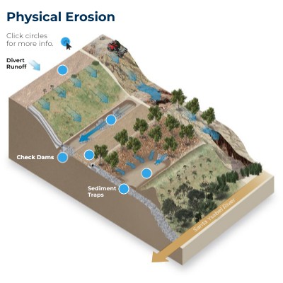 Direct concentrated flows through ditches with grade control structures (such as check dams) to reduce erosion in operations on access roads. Grade control structures slow the velocity of flow, reduce channel erosion, and promote the capture of pollutants carried in bed- and suspended-loads. KEY FEATURES: • Divert Runoff • Capture