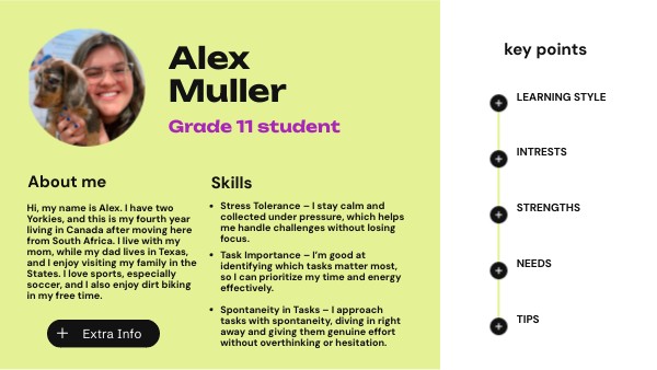 Hi, my name is Alex. I have two Yorkies, and this is my fourth year living in Canada after moving here from South Africa. I live with my mom, while my dad lives in Texas, and I enjoy visiting my family in the States. I love sports, especially soccer, and I also enjoy dirt biking in my free time.