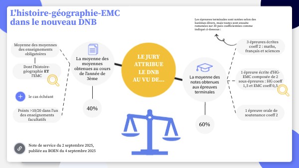 Au sein du contrôle continu, l’histoire-géographie et l’EMC sont considérés comme deux enseignements distincts. Chacun est affecté d’un coefficient 1, au même titre que les autres enseignements obligatoires, et figure séparément dans les bulletins, tant pour les notes que pour les appréciations, a minima pour la classe de troisième. "L'évaluation du niveau des élèves, en référence au socle commun de connaissances, de compétences et de culture, est menée dans les différentes situations d'apprentissage qui sollicitent la mémorisation, l’application et le réinvestissement. Par des activités écrites ou orales, individuelles ou collectives, les professeurs évaluent en attribuant une note de 0 à 20. [...] Le contrôle continu se fonde sur les moyennes des moyennes annuelles, issues des moyennes trimestrielles ou semestrielles de chacun des enseignements obligatoires en classe de troisième." Note de service du 2 septembre 2025, publiée au BOEN du 4 septembre 2025.