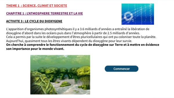 THEME 1 : SCIENCE, CLIMAT ET SOCIETE CHAPITRE 1 : L'ATMOSPHERE TERRESTRE ET LA VIE ACTIVITE 3 : LE CYCLE DU DIOXYGENE L'apparition d'organismes photosynthétiques il y a 3.6 milliards d'années a entraîné la libération de dioxygène d'abord dans les océans puis dans l'atmosphère à partir de 2.5 milliards d'années. Cela a permis par la suite le développement d'êtres pluricellulaires qui ont pu coloniser toute la planète. Aujourd'hui, quasiment tous les êtres vivants dépendent du dioxygène pour leur survie. On cherche à comprendre le fonctionnement du cycle de dioxygène sur Terre et à mettre en évidence son importance pour le monde vivant.