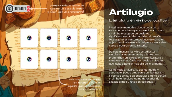 Imagina un memorice donde cada carta esconde no solo un personaje literario, sino un símbolo cargado de posibles significaciones. Al descubrirlas, el desafío lleva a generar interpretaciones de cómo el objeto ilumina la esencia del personaje y abre nuevas lecturas de su historia. De esta manera, las y los estudiantes ejercitan la argumentación, a la vez que profundizan en la relación entre literatura y metáfora visual. Cada par revela un vínculo que invita a pensar más allá de lo evidente. Como todo artilugio, su uso es líquido y adaptable: puede emplearse en literatura, filosofía o artes, o en cualquier ámbito donde el símbolo funcione como detonador de análisis crítico y reflexión colectiva.