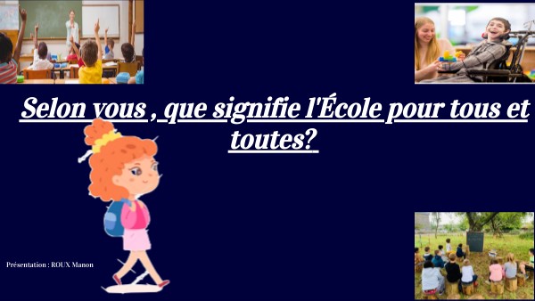 →Pour moi , l'école est le lieux où se transmet l'éducation. Pour répondre à ce que signifie l'école pour tous et toutes , il me semble essentiel d'inclure la notion d'éducation.
