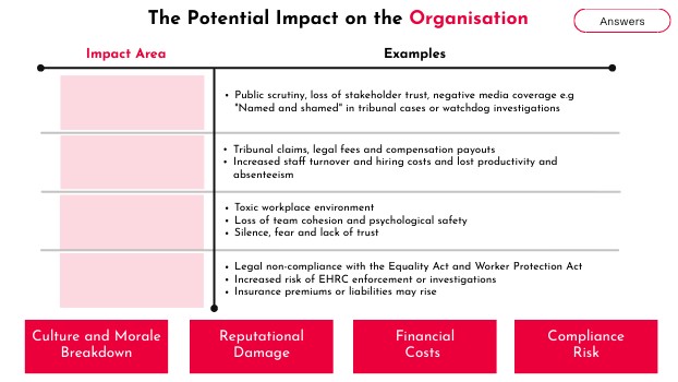 - Public scrutiny, loss of stakeholder trust, negative media coverage e.g "Named and shamed" in tribunal cases or watchdog investigations