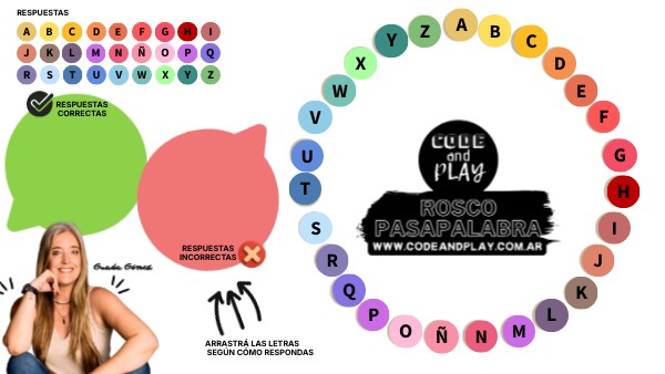 Personalizá este Rosco para jugar a "Pasapalabra" con tus alumnos. Creado por Guada de Code and Play. Encontrá más recursos en www.codeandplay.com.ar