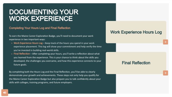 By completing both the Hours Log and the Final Reflection, you’ll be able to clearly demonstrate your growth and achievements. These steps not only help you qualify for the Maine Career Exploration Badge but also prepare you to talk confidently about your skills with colleges, training programs, and future employers.Final Reflection