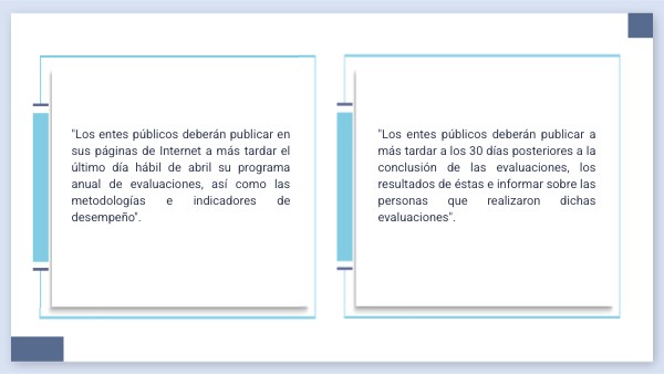 "Los entes públicos deberán publicar a más tardar a los 30 días posteriores a la conclusión de las evaluaciones, los resultados de éstas e informar sobre las personas que realizaron dichas evaluaciones".
