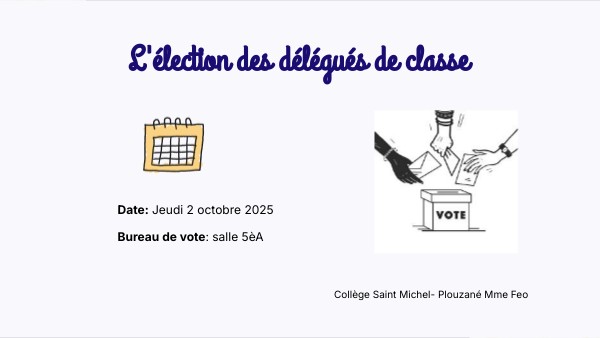 Avant le vote pour les délégués de classe, chaque candidat se présente et fait connaitre ses motivations. Le jour du vote: installation du bureau de vote. Les noms des candidats sont affichés au tableau. Deux élèves volontaires (qui ne sont pas candidats) se présentent pour être assesseurs: ils signeront le procès verbal à la fin de l'élection.