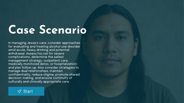 In managing Jesse’s care, consider approaches for evaluating and treating alcohol use disorder amid acute, heavy drinking and potential withdrawal. Assess his risk for severe complications, determine the safest management strategy—outpatient care, medically monitored detox, or hospitalization—and plan follow-up. Also consider strategies to manage dual relationships, maintain confidentiality, reduce stigma, promote shared decision-making, and ensure continuity of culturally and clinically appropriate care.