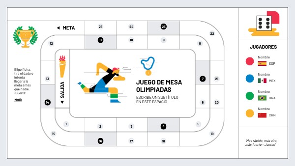Pueden jugar de 2 a 4 jugadores/as. Cada jugador/a debe elegir una ficha (amarilla, azul, roja o verde) y lanzar el dado. El jugador/a que obtenga el número más alto será el que comience la partida. Para jugar cada participante debe lanzar el dado y mover su ficha hasta la casilla que corresponda. En cada casilla debe haber una pregunta sobre “Deportes”. Si responde correctamente puede seguir avanzando, si no lo hace pasa el turno al siguiente jugador. En el tablero hay además 6 casillas especiales (en gris con el número en negro) en las que el jugador/a pierde un turno sin jugar. Ganará el jugador/a que llegue en primer lugar a la meta.