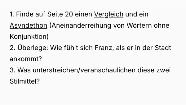 1. Finde auf Seite 20 einen Vergleich und ein Asyndethon (Aneinanderreihung von Wörtern ohne Konjunktion) 2. Überlege: Wie fühlt sich Franz, als er in der Stadt ankommt? 3. Was unterstreichen/veranschaulichen diese zwei Stilmittel?