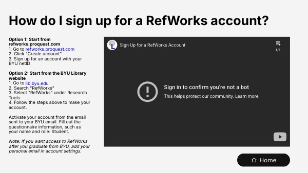 Option 1: Start from refworks.proquest.com 1. Go to 2. Click "Create account" 3. Sign up for an account with your BYU netID Option 2: Start from the BYU Library website 1. Go to 2. Search "RefWorks" 3. Select "RefWorks" under Research Tools 4. Follow the steps above to make your account. Activate your account from the email sent to your BYU email. Fill out the questionnaire information, such as your name and role: Student. Note: If you want access to RefWorks after you graduate from BYU, add your personal email in account settings.