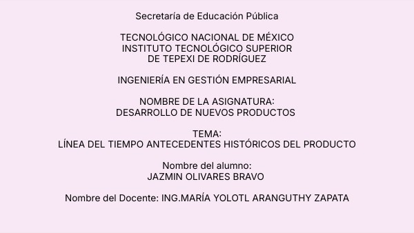 Secretaría de Educación Pública TECNOLÓGICO NACIONAL DE MÉXICO INSTITUTO TECNOLÓGICO SUPERIOR DE TEPEXI DE RODRÍGUEZ INGENIERÍA EN GESTIÓN EMPRESARIAL NOMBRE DE LA ASIGNATURA: DESARROLLO DE NUEVOS PRODUCTOS TEMA: LÍNEA DEL TIEMPO ANTECEDENTES HISTÓRICOS DEL PRODUCTO Nombre del alumno: JAZMIN OLIVARES BRAVO Nombre del Docente: ING.MARÍA YOLOTL ARANGUTHY ZAPATA