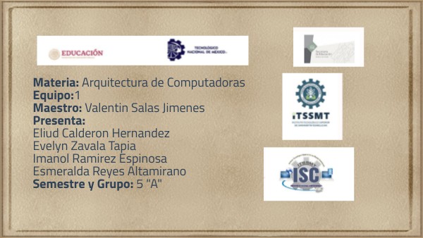 Materia: Arquitectura de ComputadorasEquipo:1Maestro: Valentin Salas Jimenes Presenta: Eliud Calderon Hernandez Evelyn Zavala Tapia Imanol Ramirez Espinosa Esmeralda Reyes Altamirano Semestre y Grupo: 5 "A"