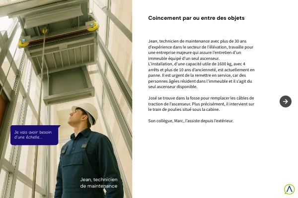 Jean, technicien de maintenance avec plus de 30 ans d’expérience dans le secteur de l’élévation, travaille pour une entreprise majeure qui assure l’entretien d’un immeuble équipé d’un seul ascenseur. L’installation, d’une capacité utile de 1600 kg, avec 4 arrêts et plus de 10 ans d’ancienneté, est actuellement en panne. Il est urgent de la remettre en service, car des personnes âgées résident dans l’immeuble et il s’agit du seul ascenseur disponible. José se trouve dans la fosse pour remplacer les câbles de traction de l’ascenseur. Plus précisément, il intervient sur le train de poulies situé sous la cabine. Son collègue, Marc, l’assiste depuis l’extérieur.