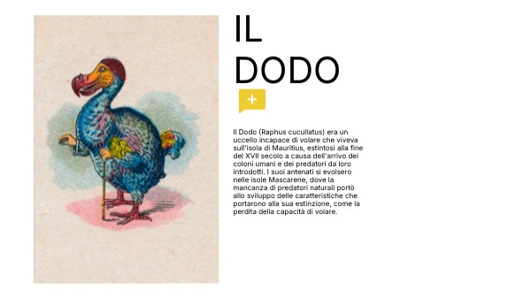 Il Dodo (Raphus cucullatus) era un uccello incapace di volare che viveva sull'isola di Mauritius, estintosi alla fine del XVII secolo a causa dell'arrivo dei coloni umani e dei predatori da loro introdotti. I suoi antenati si evolsero nelle isole Mascarene, dove la mancanza di predatori naturali portò allo sviluppo delle caratteristiche che portarono alla sua estinzione, come la perdita della capacità di volare.