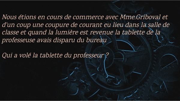 Nous étions en cours de commerce avec Mme.Griboval et d'un coup une coupure de courant eu lieu dans la salle de classe et quand la lumière est revenue la tablette de la professeuse avais disparu du bureau Qui a volé la tablette du professeur ?
