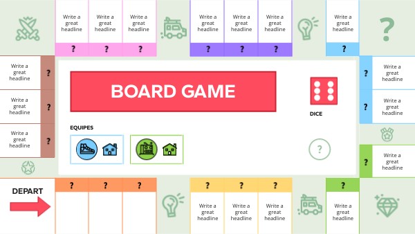 Each player must choose a color: blue, green, yellow, or pink. This gives them a token to mark their position and 10 houses to indicate the properties they acquire throughout the game. Each player must take their colored token and place it on the starting space. To start playing, click on the dice and move your token to the corresponding space. On each space, there must be one or more questions. If you answer correctly, place one of your houses on that space. Congratulations, you have acquired a new property! Special spaces: spaces with icons may contain penalties such as "The player pays light taxes: loses 2 houses". Answer the question correctly to avoid the penalty! The player who has the most houses on the board once all spaces are occupied will win.