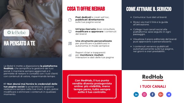 Le Bebé ti mette a disposizione la piattaforma RedHab, che semplifica la gestione dei tuoi social, li mantiene sempre aggiornati e ti permette di restare in contatto con i tuoi clienti con contenuti di valore, risparmiando tempo. 👉 Non dovrai mai fornire le credenziali delle tue pagine social: la proprietà e la gestione resteranno sempre nelle tue mani. In più, potrai modificare o eliminare i contenuti in qualsiasi momento.