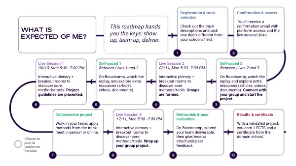 Session Live 3 17/11 lundi 17h30–19h00 Plénière interactive + salles de sous-groupes pour découvrir les méthodes/outils principaux. Concluez votre projet de groupe.