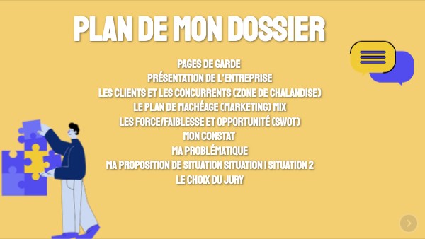 Pages de garde Présentation de l'entrepriseLes clients et les concurrents (zone de chalandise)Le plan de machéage (marketing) mixLes force/faiblesse et opportunité (SWOT)Mon constat Ma problématiqueMa proposition de situation situation 1 situation 2Le choix du jury