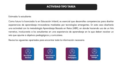 Estimado/a estudiante: Como futuro/a licenciado/a en Educación Infantil, es esencial que desarrolles competencias para diseñar experiencias de aprendizaje innovadoras mediadas por tecnologías emergentes. En este caso diseñarás una actividad con la metodología Aprendizaje Basado en Retos (ABR), en donde haciendo uso de un hilo narrativo, involucrarás a los estudiantes en una experiencia de aprendizaje en la que deben resolver un reto que apunte a objetivos pedagógicos y curriculares. Revisa los siguientes apartados para encontrar toda la información necesaria.